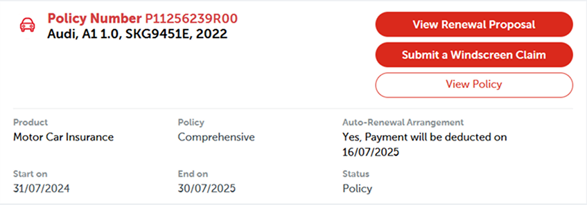 The old My Policies page overwhelmed users with all buttons in the same red brand color which lacked hierarchy. There was also zero policy status visibility, so customers are not aware that they can renew their policy.