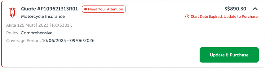 • Added prominent visual cues "Start Date Expired. Update to Purchase." to better inform users what they have to do to purchase the policy.